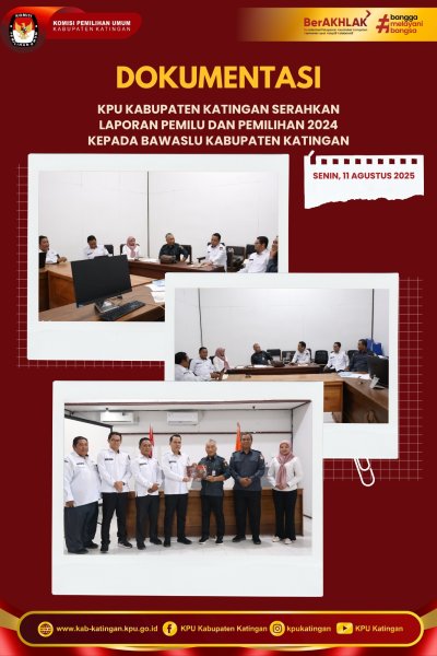 Penyampaian Laporan Pemilu dan laporan pemilihan bupati dan Wakil Bupati Katingan Tahun 2024 dari Ketua KPU Kabupaten Katingan Bapak Wahyuni kepada Ketua BAWASLU Kabupaten Katingan Yosafat Ericktovia Kawung Senin (11/08/2025).