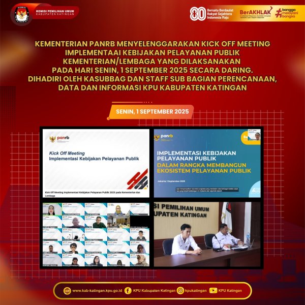 #TemanPemilih, Kasubbag dan staff Sub Bagian Perencanaan, Data dan Informasi KPU Kabupaten Katingan mengikuti secara daring kegiatan Kick Off Meeting Implementasi Kebijakan Pelayanan Publik yang diselenggarakan oleh Kementerian PANRB pada Senin, 1 September 2025, guna mendukung peningkatan ekosistem layanan publik lintas kementerian dan lembaga.