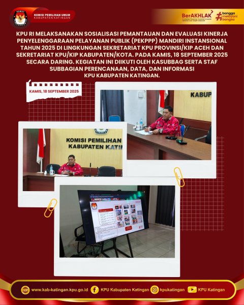 #TemanPemilih, KPU Kabupaten Katingan mengikuti sosialisasi daring Pemantauan dan Evaluasi Kinerja Penyelenggaraan Pelayanan Publik (PEKPPP) Mandiri Instansional tahun 2025 yang dilaksanakan oleh KPU RI pada Kamis, 18 September 2025. Kegiatan ini diikuti oleh Kasubbag dan staf Subbagian Perencanaan, Data, dan Informasi sebagai bentuk komitmen peningkatan kualitas layanan publik di lingkungan KPU Kabupaten Katingan.