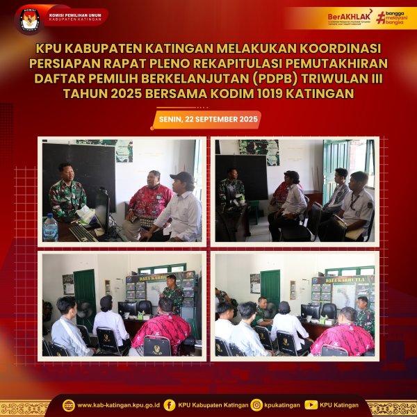 #TemanPemilih, KPU Kabupaten Katingan bersama Kodim 1019 Katingan melakukan koordinasi persiapan rapat pleno rekapitulasi Pemutakhiran Daftar Pemilih Berkelanjutan (PDPB) Triwulan III Tahun 2025, Senin (22 September 2025). Kolaborasi ini bertujuan memastikan data pemilih yang akurat dan berkualitas demi kelancaran proses demokrasi di Kabupaten Katingan.