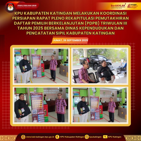 #TemanPemilih, KPU Kabupaten Katingan bersama Disdukcapil Kabupaten Katingan melakukan koordinasi persiapan rapat pleno rekapitulasi Pemutakhiran Daftar Pemilih Berkelanjutan (PDPB) Triwulan III Tahun 2025, Jumat (26 September 2025). Sinergi ini bertujuan memastikan data pemilih yang akurat dan berkualitas demi kelancaran proses demokrasi di Kabupaten Katingan.