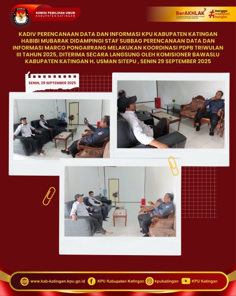 KPU Kabupaten Katingan melaksanakan Koordinasi Pemutakhiran Data Pemilih Berkelanjutan (PDPB) Triwulan III Tahun 2025 bersama Bawaslu Kabupaten Katingan pada Senin, 29 September 2025.