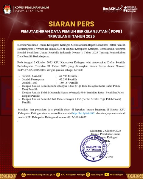 Berikut Siaran Pers terkait Rekapitulasi Pemutakhiran Data Pemilih Berkelanjutan (PDPB) Triwulan III Tahun 2025.