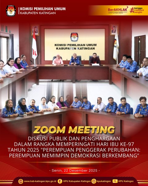 #TemanPemilih, Senin (22 Desember 2025) KPU Kabupaten Katingan mengikuti Diskusi Publik dan Penghargaan dalam Rangka Memperingati Hari Ibu ke-97 Tahun 2025 "Perempuan Penggerak Perubahan: Perempuan Memimpin Demokrasi Berkembang, kegiatan ini diadakan oleh KPU RI secara daring melalui zoom.