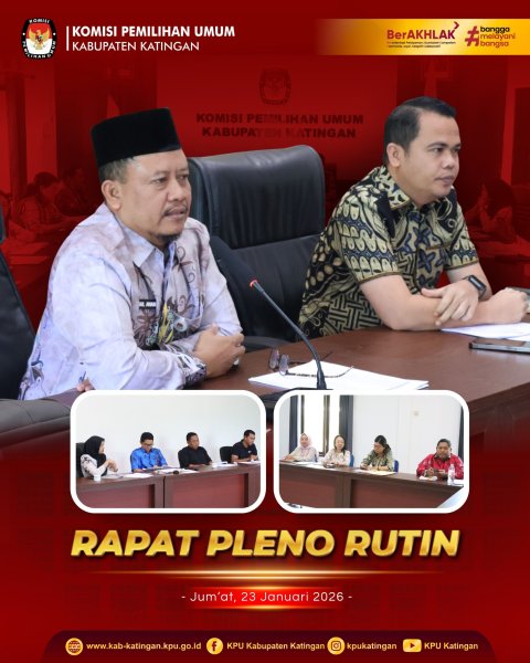 #TemanPemilih, KPU Kabupaten Katingan melaksanakan Rapat Pleno Rutin yang diikuti oleh Ketua, Anggota KPU, serta jajaran Sekretariat KPU Kabupaten Katingan, bertempat di Aula KPU Kabupaten Katingan, Jumat (23/1/2026). Rapat pleno ini membahas evaluasi pelaksanaan tugas serta koordinasi internal dalam rangka mendukung kelancaran pelaksanaan tugas dan fungsi KPU Kabupaten Katingan. #KPUMelayani