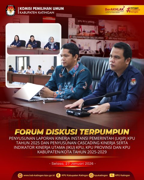 KPU KABUPATEN KATINGAN – Komisi Pemilihan Umum (KPU) Kabupaten Katingan mengikuti Forum Diskusi Terpumpun (FDT) dalam rangka penyusunan Laporan Kinerja Instansi Pemerintah (LKjIP) KPU Tahun 2025 serta sinkronisasi Cascading Kinerja dan Indikator Kinerja Utama (IKU) KPU, KPU Provinsi, dan KPU Kabupaten/Kota Tahun 2025–2029 yang diselenggarakan oleh KPU RI secara daring, Selasa (27/1/2026). Kegiatan tersebut diikuti oleh Ketua, Anggota dan Jajaran Sekretariat KPU Kabupaten Katingan.