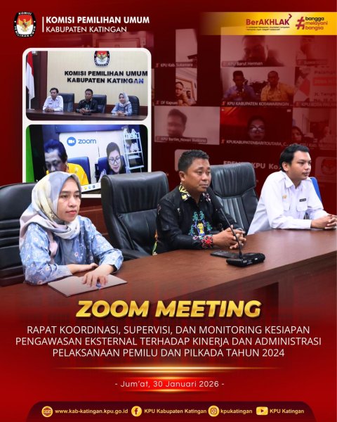 KASONGAN – Jajaran KPU Kabupaten Katingan mengikuti Rapat Koordinasi, Supervisi, dan Monitoring Kesiapan Pengawasan Eksternal terhadap Kinerja dan Administrasi Pelaksanaan Pemilu dan Pilkada Tahun 2024. Kegiatan ini dilaksanakan secara daring melalui Zoom Meeting bersama KPU Provinsi dan KPU Kabupaten/Kota lainnya.