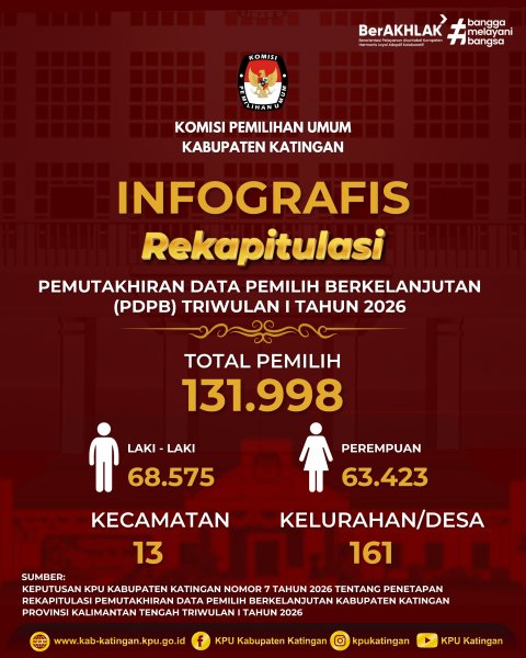 Data ini ditetapkan berdasarkan Keputusan KPU Kabupaten Katingan Nomor 7 Tahun 2026. Melalui rangkaian kegiatan COKTAS dan sinkronisasi data yang ketat, tercatat total pemilih di Kabupaten Katingan mencapai 131.998 jiwa.