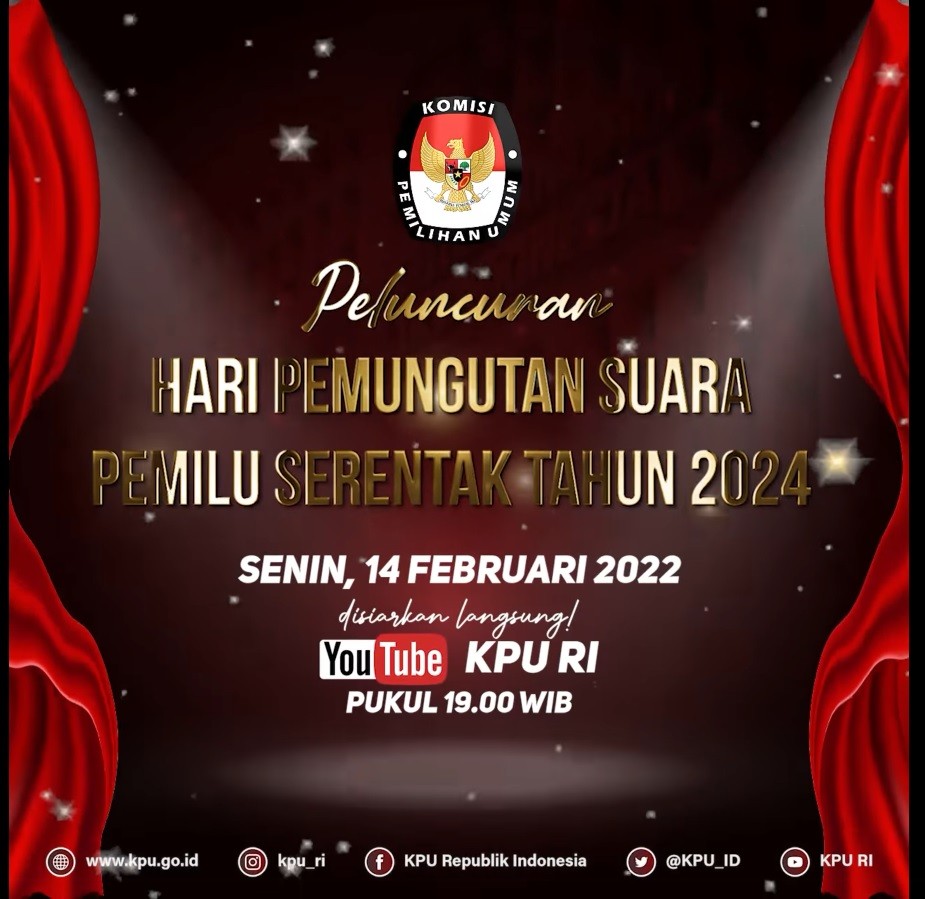 #TemanPemilih, saksikan dan ikuti Peluncuran Hari Pemungutan Suara Pemilu Serentak Tahun 2024 yang akan digelar pada Hari Senin tanggal 14 Februari 2022..