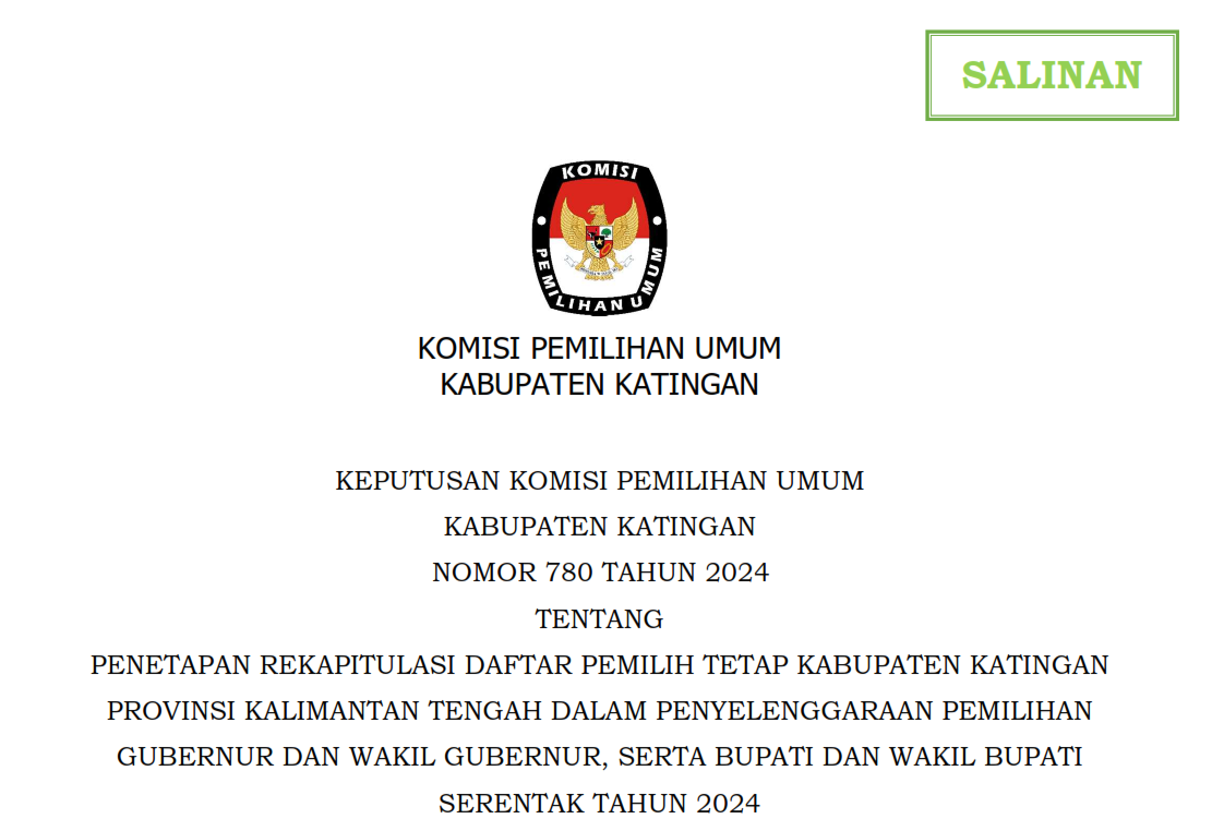 Surat Keputusan Penetapan Daftar Pemilih Tetap Kabupaten Katingan Dalam Penyelenggaraan Pemilihan Gubernur dan Wakil Gubernur, serta Bupati dan Wakil Bupati Serentak Tahun 2024
