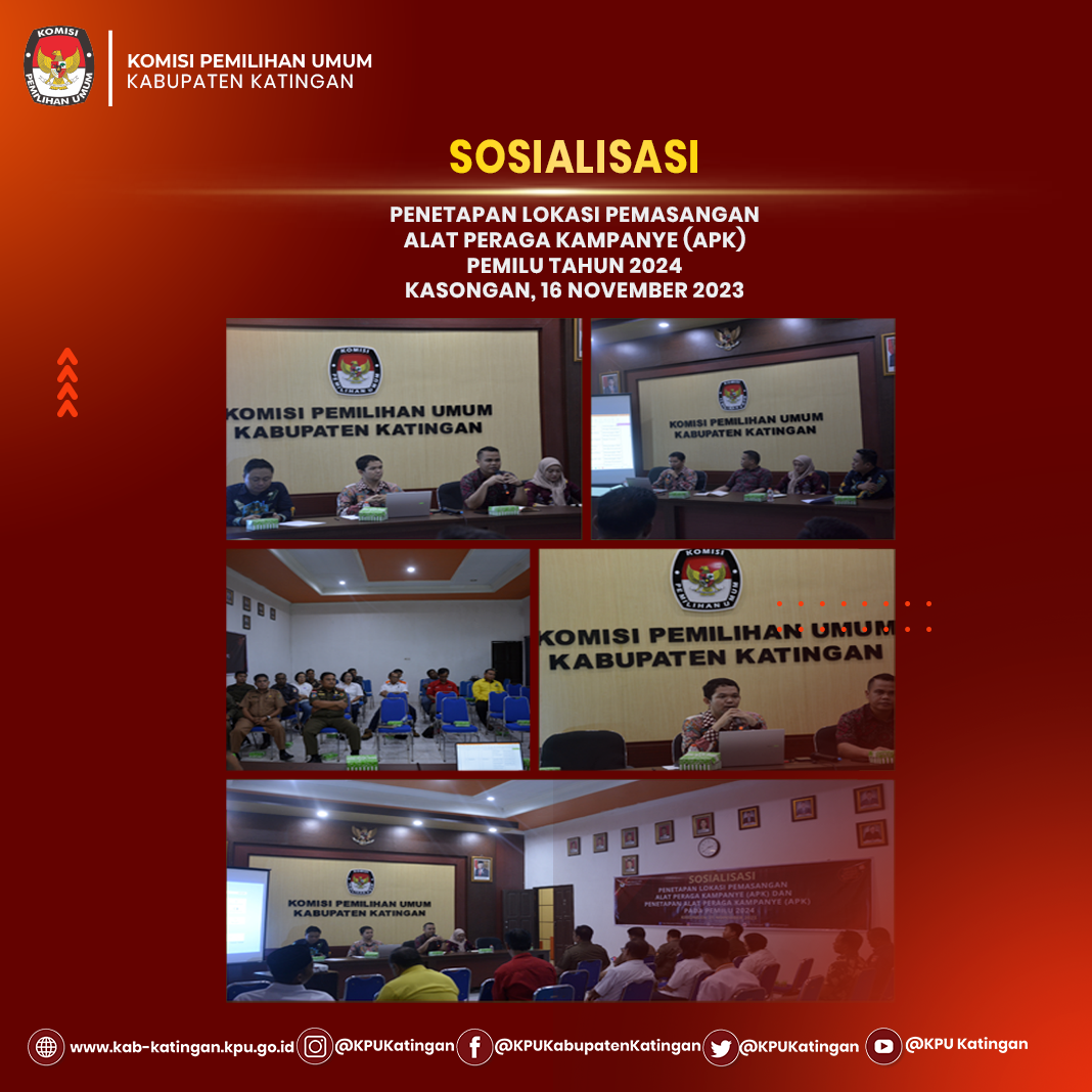 KPU Kabupaten Katingan Melakukan Sosialisasi Penetapan Lokasi Pemasangan APK Pemilu Tahun 2024 kepada Partai Politik dan Pihak Pemerintah Daerah Kabupaten Katingan. Kegiatan dilaksanakan di Kantor KPU Kabupaten Katingan dipimpin langsung oleh Ketua KPU Kabupaten Katingan Wahyuni di dampingi oleh Didun Niaton, Ovi Monita dan Krisfiatno selaku Anggota KPU Kabupaten Katingan Periode 2023 - 2028.