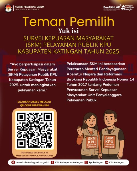 #TemanPemilih, Ayo berpartisipasi dalam Survei Kepuasan Masyarakat (SKM) Pelayanan Publik KPU Kabupaten Katingan Tahun 2025. untuk meningkatkan pelayanan kami. Silahkan scan QR diatas atau klik disini.